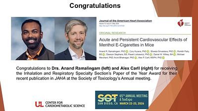 Congratulations to Drs. Anand Ramalingam and Alex Carll, who received the Paper of the Year Award from the Inhalation and Respiratory Specialty Section of the Society of Toxicology (SOT) at their recent annual meeting.
