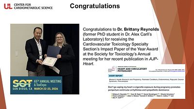 Congratulations to Dr. Brittany Reynolds, a former Trainee in the Laboratory of Dr. Alex Carll, who received the Paper of the Year Award from the Cardiovascular Toxicology Specialty Section of the Society of Toxicology at their recent annual meeting.