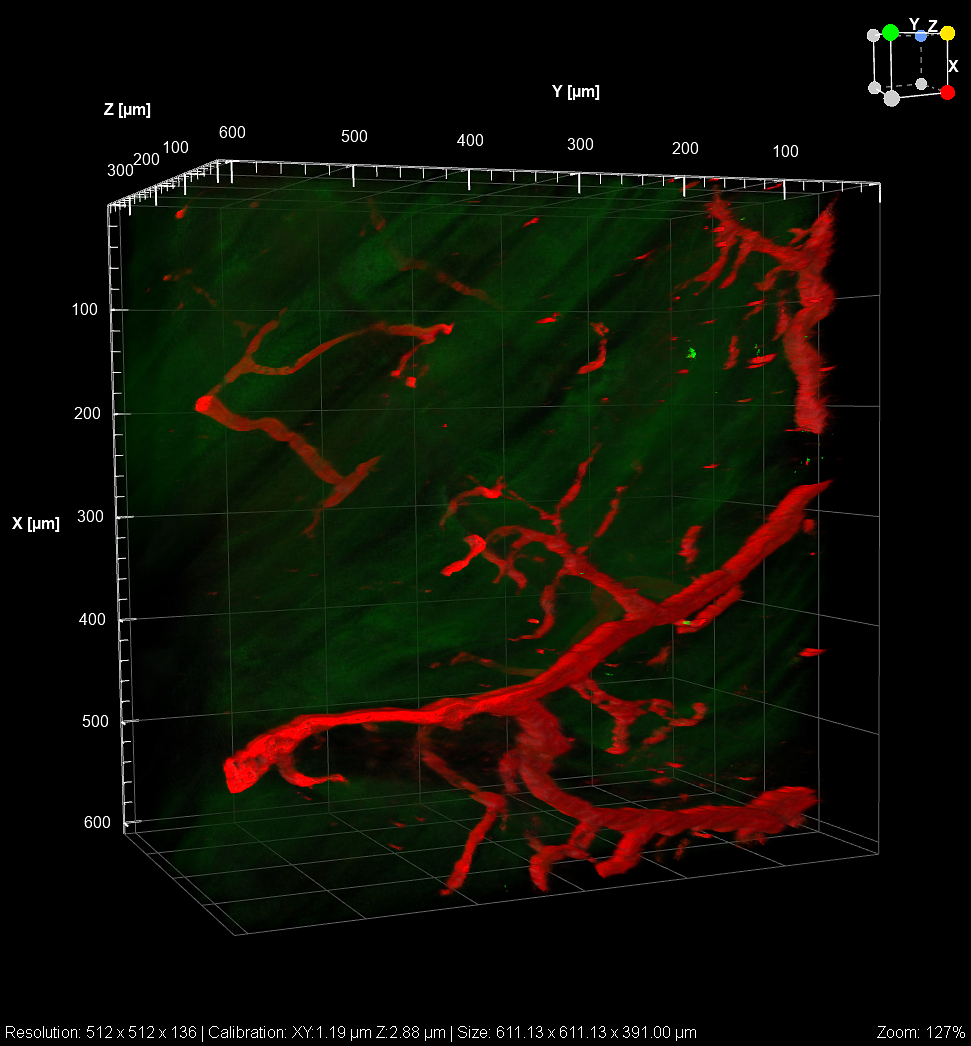 The Nikon A1R Upright Multiphoton Microscope is a turn-key confocal, multiphoton platform for a large field-of-view, high-resolution and deep-tissue imaging of live or fixed specimens, including intravital studies. It combines a high-speed resonant scanner for fast dynamics with a galvano scanner for highest spatial resolution. Built on an FN1 upright body with a motorized XYZ stage and piezo Z drive for rapid z-stacks acquisitions, the system is equipped with four visible lasers (405/488/561/640 nm), a Coherent Discovery dual-beam IR laser for multiphoton excitation and GaAsP detector system. Seven objectives support a wide range of preparations. A high-end NIS-Elements acquisition workstation and a separate offline analysis workstation enable streamlined capture, 3D/4D visualization, and quantitative analysis. Additionally, the Nikon A1R can integrate with physiological monitoring systems, allowing real-time tracking of vital parameters such as heart rate or respiration during intravital imaging.